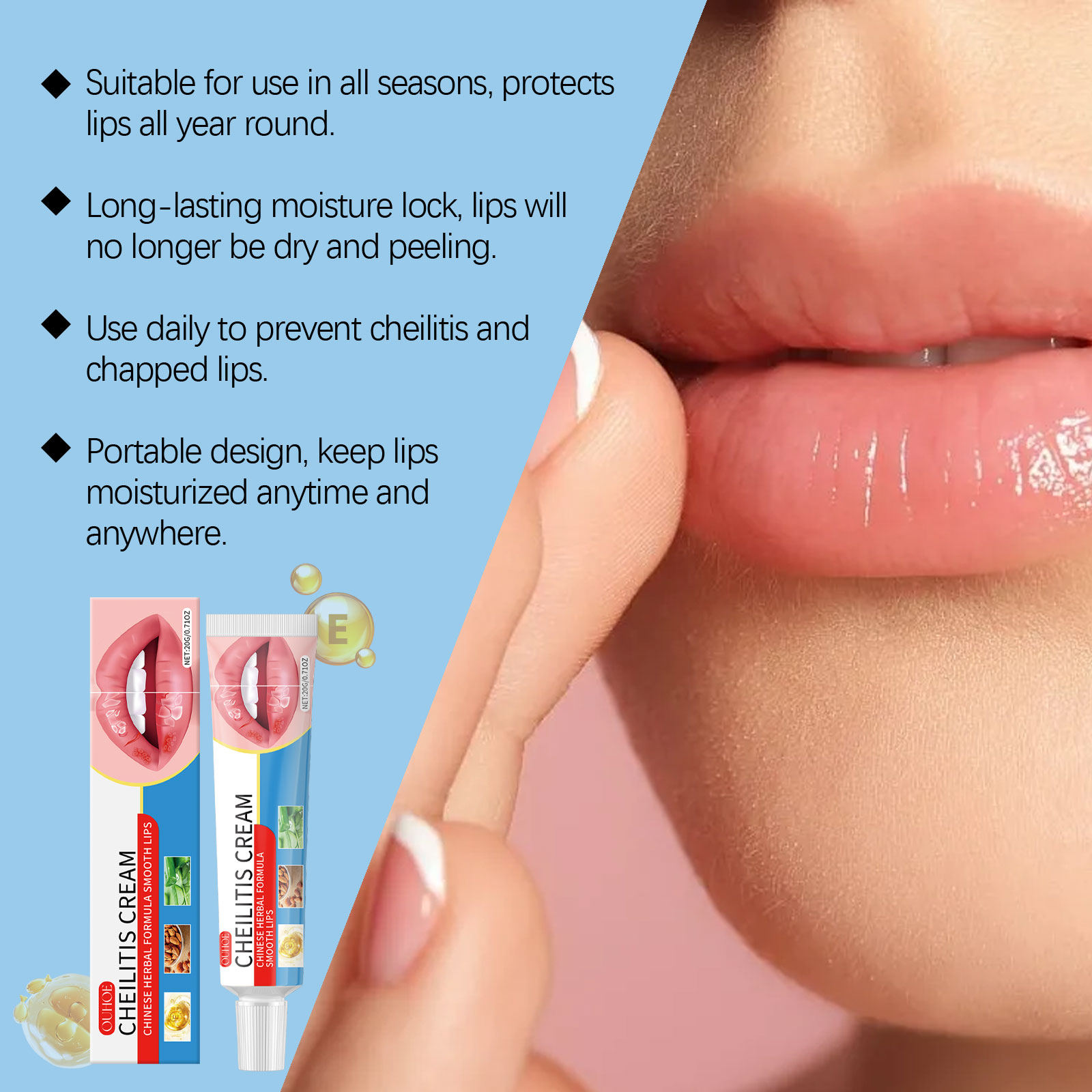Our lip moisturizer contains vitamin E and shea butter. It can repair cleft lip and prevent cheilitis. The way to use it is very simple: gently wash your lips with warm water, keep dry, take a proper amount of lip balm, evenly apply to the upper and lower lips, make sure to cover the entire lips. And the formula is mild, non-irritating ingredients, suitable for all lip skin.